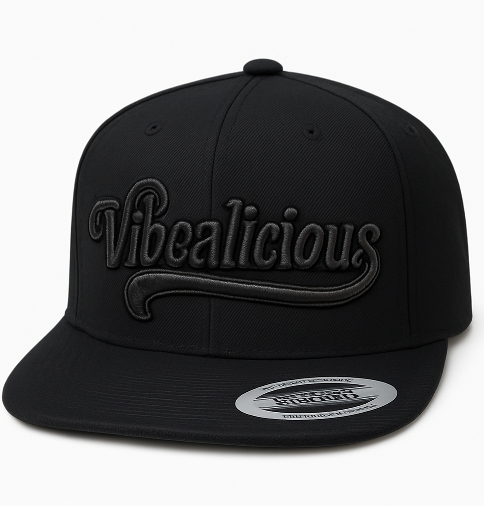 Crafted from premium structured fabric and finished with a high-gloss, embossed “Vibealicious” logo, this all-black statement piece catches the light like liquid metal. Clean lines, bold presence, and a silhouette built to elevate any fit — from yacht decks to nightlife adventures.